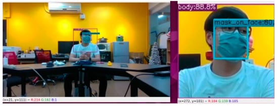 The test was divided into two parts. First, there was only one person in the image, and the person walked within the visible range in order to test the tracking effect of this method. Three angles were tested in the single-person test method: 60 degrees, 90 degrees, and 120 degrees. Each angle was used to test whether a mask was worn, and each state tested for about 100 frames. In the other part, there were five persons in the frame simultaneously. The subjects were asked to speak in sequence from left to right during the test. Each person was tested on whether they wore a mask for about 100 frames. In this way, the success rate and error rate of this identification method could be tested in the situation of multiple people.