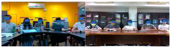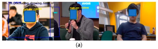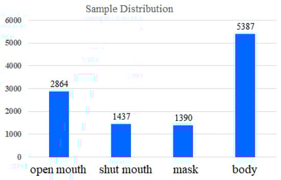 Figure 8. There are many categories of mouth opening because we focused on detecting the state of mouth opening, and there is no particular mouth shape when closing the mouth. As for the appearance of the masks, they were all similar, with only differences in design and color, so they were easier to identify. In addition, the label of the upper-body category is several times the size of other categories. The reason for this is that, regardless of the category of opening the mouth, shutting the mouth, or wearing a mask, as long as there are photos of the half-body picture, the label of the upper-body category needs to be marked. Therefore, the label of the upper-body category is almost equivalent to summing the number of labels for the other three categories. In this study, the data distribution was not balanced and data augmentation is often used to increase the dataset’s size. Hopefully, the gaps among the categories are not too large and resizing, rotating, and flipping the images can close them.