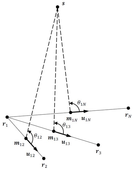 We remark that, based on (19), the 1D-AOA noise is minimized if with rad; i.e., the emitter is equidistant from the sensor pair and . This suggests that a necessary condition for optimal sensor–emitter geometry would be to have all TDOA sensors equidistant from the emitter, assuming of course that prior knowledge of the emitter location is available. Referring to (21) we see that tends to infinity if or , which happens if the emitter and TDOA sensor pair and are collinear. This represents the worst TDOA geometry and should be avoided. If due to large measurement noise and/or the TDOA sensor pair being almost collinear with the emitter, cannot be computed from (18) as the arccosine function will have an argument with an absolute value exceeding one. In such cases, dropping those TDOA measurements with from the estimation process (if ) or using a different reference sensor may resolve the problem. To sum up, an optimal sensor–emitter geometry would have , .