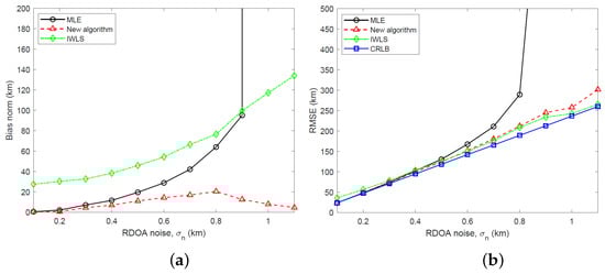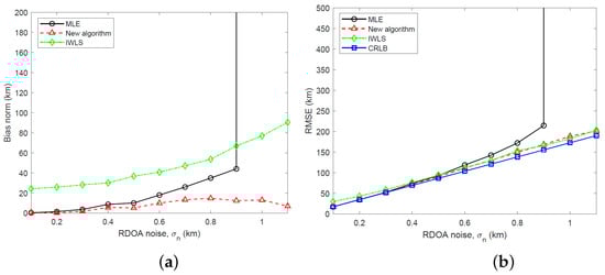 We have simulated the bias and RMSE of the new two-stage algorithm and IWLS, developed in Section 5, and the MLE computed using the GN algorithm for three different emitter heights: km, km and km. The simulation results and CRLB, calculated by taking the square root of the trace of the CRLB matrix, are shown in Figure 5, Figure 6 and Figure 7 for RDOA noise standard deviation in the range km. Considering an emitter at km with carrier frequency 2 GHz (L band), bandwidth 1 MHz and time interval of 1 ms for TDOA measurements, the simulated RDOA noise range approximately corresponds to an effective transmit power of 500 mW at km and 43.5 mW at km, which is practical for LEO satellite localization. To arrive at these emitter transmit powers, we have used a link budget analysis based on the TDOA variance bound derived in []. In the simulations, the IWLS is iterated four times. The GN algorithm uses 10 iterations and is initialized to the true target location.
