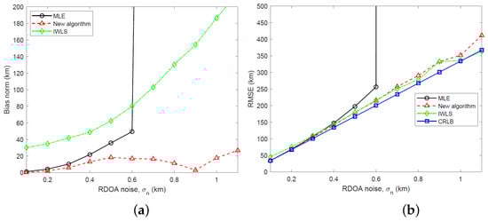 (a) Plot of bias norm versus RDOA noise for MLE, new algorithm and IWLS ( km). (b) Plot of RMSE versus RDOA noise for MLE, new algorithm and IWLS along with CRLB ( km).