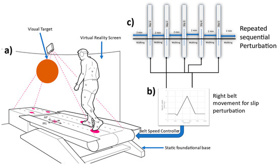 Even though weight-shifting errors and trips account for 62% of falls in long-term care facilities, slip recovery failures also commonly lead to falls [6]. A slip occurs when an individual’s center of mass (COM) is located outside their base of support, which can be compensated for by a corrective movement to avoid falling. Various gait abnormalities, including gait speed, stride time, step width/length, single and double limb stance times, and gait symmetry, may contribute to increased slip risk and fall incidents in individuals of all ages [7]. Mainly older adults with a stroke, gait asymmetry, increased stride time, reduced gait speed, and increased medial-lateral amplitude have an increased risk of falls [8,9]. For an intervention for slip-related falls, Pai et al. proposed enhancing dynamic stability and altering weight support can significantly increase the chances of a successful slip recovery through a compensatory backward step [10]. The same group discovered a strong correlation between increased gait speed and improved stability during a slip [11].