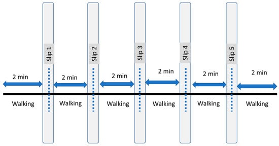 A 12 min walking protocol with five repeated perturbations occurring 2 min apart. The slips were induced during the heel strike event.
