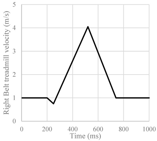 All participants were given a visual target on a virtual reality screen and were asked to look at the target while walking. Each participant was instructed to perform a 5 min normal walking trial. All normal gait characteristics were evaluated from these trials, and they served as acclimatization before the perturbation walking trial. Subsequently, a 12 min walking trial was conducted, during which five intermittent slip perturbations were introduced, with approximately two-minute intervals between each perturbation. Figure 1 provides an overview of experimental protocol. The first perturbation was initiated at approximately 2 min, or 12,000 frames, after the start of the trial, followed by subsequent perturbations scheduled for 2 min, or 12,000 frames, after each perturbation (refer to Figure 2). This perturbation timing varied slightly on right heel contact timing. A protocol similar to that used by Sessoms et al. was adopted [17] (Figure 3). When a frame that was designated as a perturbation elapsed, the system would await a force on the right force plate that exceeded the preset threshold based on the participant’s weight. Once such a force was detected, the right treadmill belt would rapidly accelerate (15 m/s2) in the direction of motion, inducing a slip (refer to Figure 3 and Figure 4).