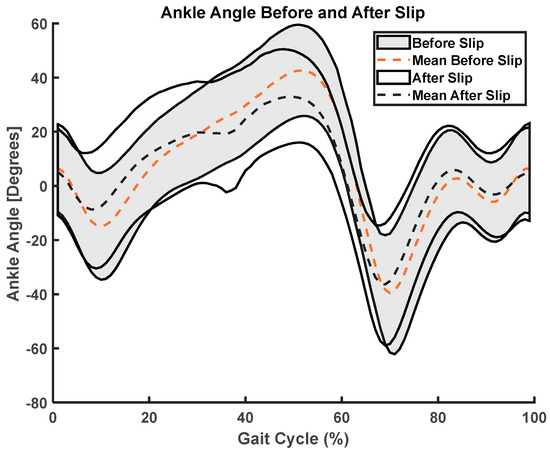 Before and after slip ankle angle; (i) mean (dotted) during a gait cycle, (ii) standard deviation (shaded).