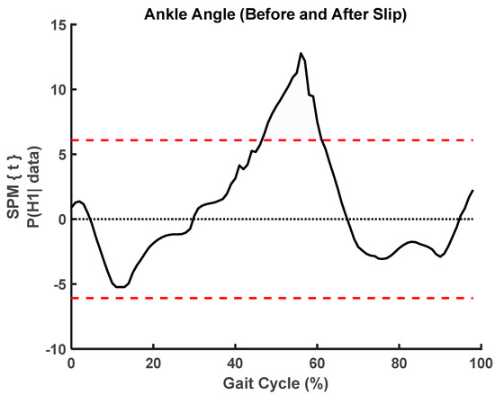 SPM analysis of ankle angle curves before and after slip. The shaded region shows significant differences from 45% of gait cycle to 65% of gait cycle.
