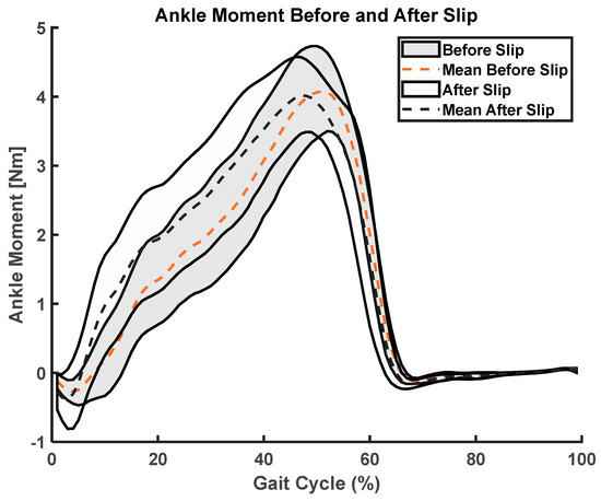 Before and after slip ankle moments (i) mean ankle moments represented as dotted lines during a gait cycle, (ii) standard deviation shown as shaded regions bounding the mean.