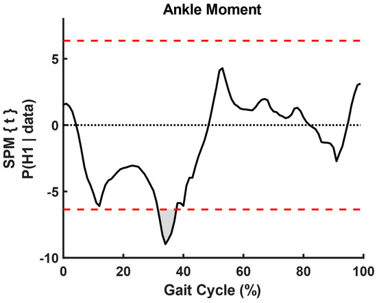 SPM analysis of ankle moment curves before and after slip. The shaded region shows significant differences from 30% of gait cycle to 40% of gait cycle. The dotted red lines show 95% confidence upper and lower bounds. The black dotted line shows zero SPM between the curves.