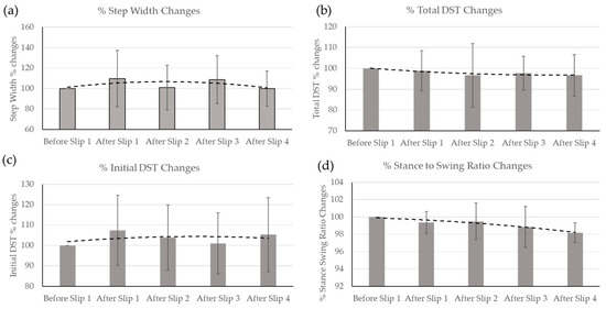 Considering gait parameter initial values at 100% before the first slip, the percent change in step width, double support time, initial double support time (a component of double support time), and stance-to-swing ratio times were evaluated and shown in Figure 9 below.