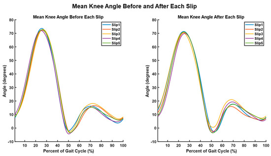 Representative graphs showing knee angles before slip and knee angles after slip from one participant. The different colors represent different slip conditions.