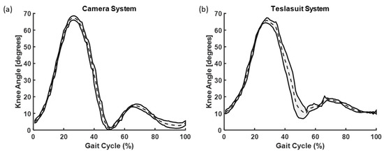 A comparative graph of knee angles evaluated from (a) camera system and (b) Teslasuit. The dotted lines represent the mean and shaded area represent the standard deviations at that time.