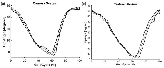 A comparative graph of hip angles evaluated from (a) camera system and (b) Teslasuit. The dotted lines represent the mean and shaded area represent the standard deviations at that time.