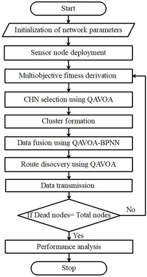 This research performs an effective data fusion and cluster-based routing for improving the WSN performances. The BPNN is used for performing the data fusion where the weights and threshold coefficients are optimized by QAVOA. Moreover, the cluster-based routing using QAVOA is helps to choose optimum CHN and path for performing the reliable transmission. The data fusion performed by QAVOA-BPNN helps to minimize the amount of broadcasted data and eliminate the redundant data, which returns the lesser energy usage. Therefore, the lesser energy usage is used to enhance the network’s life expectancy. The flowchart for the QAVOA-BPNN is shown in Figure 1.