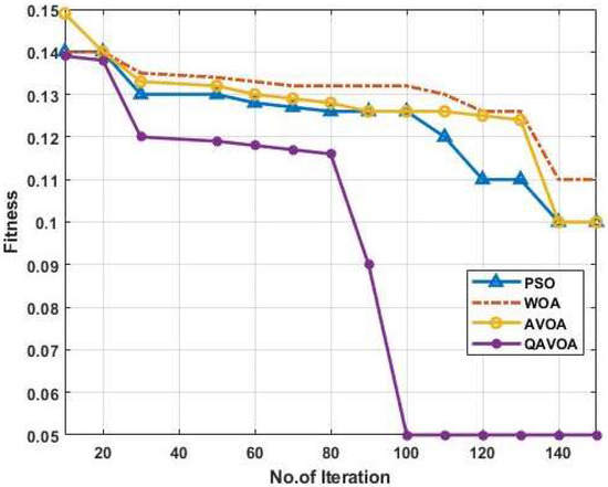 The performance of QAVOA-BPNN is analyzed using energy consumption, life expectancy, throughput, End to End Delay (EED), Packet Delivery Ratio (PDR) and Packet Loss Ratio (PLR). Here, the performances are analyzed with different optimization algorithms such as Particle Swarm Optimization, Whale Optimization Algorithm (WOA) and AVOA. The fitness graph for PSO, WOA, AVOA and QAVOA is shown in the Figure 4. The enhanced population diversity provided by the QOL in QAVOA is used to achieve a faster convergence than the PSO, WOA and AVOA.