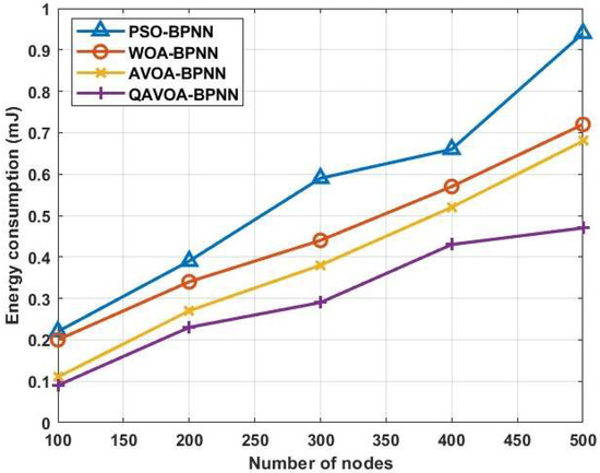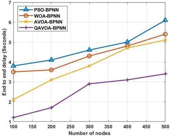 The EED comparison for QAVOA-BPNN with PSO-BPNN, WOA-BPNN and AVOA-BPNN is shown in the Figure 8 and Table 5. The QAVOA-BPNN has lesser EED than the PSO-BPNN, WOA-BPNN and AVOA-BPNN. For example, the EED of 500 nodes is 3.4 s, whereas the PSO-BPNN obtains 6.1 s, WOA-BPNN obtains 5.4 s and AVOA-BPNN 5.1 s. The enhanced population diversity of QAVOVA helps to obtain the effective CH and route discovery along with data fusion using BPNN leads to transmitting the data packet with a lesser distance. The lesser transmission distance of QAVOA-BPNN helps to minimize the delay over the WSN.