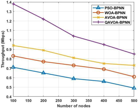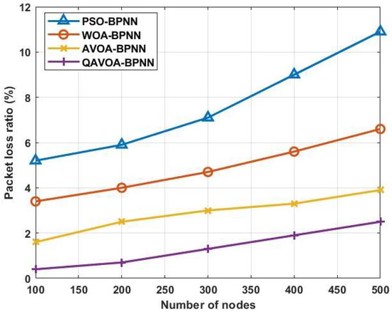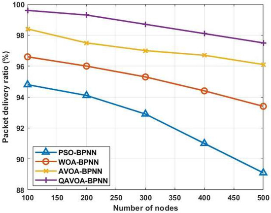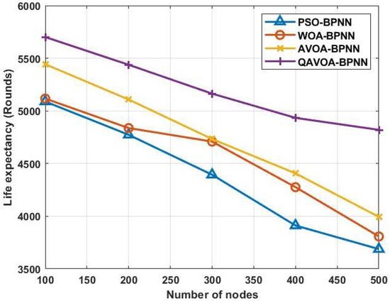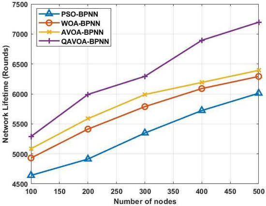 Figure 9 and Figure 10 shows the PDR and PLR analysis of QAVOA-BPNN, PSO-BPNN, WOA-BPNN and AVOA-BPNN. Further, Table 6 and Table 7 show the comparison of PDR and PLR, respectively. This analysis shows that the data delivery of the QAVOA-BPNN is improved when compared to the PSO-BPNN, WOA-BPNN and AVOA-BPNN. For example, the PDR of 500 nodes is 97.5%, whereas the PSO-BPNN obtains 89.1%, WOA-BPNN obtains 93.4% and AVOA-BPNN obtains 96.1%. The utilization of energy is decreased by fusing the data using BPNN optimized via QAVOA that helps to preserve the node’s energy. Therefore, the alive nodes of QAVOA-BPNN are increased, which helps to increase the data delivery over the network.