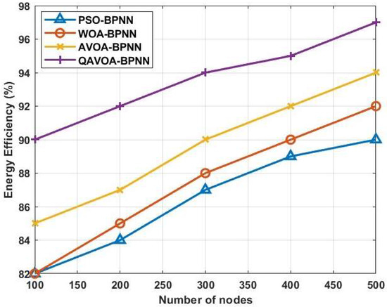 The amount of energy that is still in use after network data transmission is complete is known as energy efficiency. Figure 12 shows the nodes energy efficiency for the PSO-BPNN, WOA-BPNN, AVOA-BPNN and QAVOA-BPNN methods. The simulation experiment is run using 500 nodes for this scenario. The QAVOA-BPNN technology performs with a 97.2% energy efficiency. The energy efficiency of other protocols like PSO-BPNN, WOA-BPNN, and AVOA-BPNN is 90.1%, 92.7%, and 94.4%, respectively. The comparison of energy efficiency is shown in Table 9. Analyses demonstrate that QAVOA-BPNN operates better than the others, as evidenced by its superior performance.