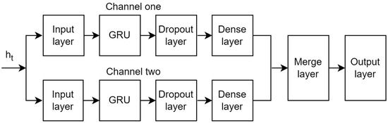 Channel prediction is to predict the channel state information at the next time steps according to the recent historical channel state data, and the channel state information is a matrix composed of complex numbers. To improve the accuracy of prediction, this paper uses GRU to construct a channel prediction model with double input and a single output. Its network structure is shown in Figure 4. Channel one and channel two are composed of the input layer, GRU, dropout layer, and dense layer [21], respectively. Then, data from channel one and channel two are fused and finally the predicted CSI is output through the output layer.