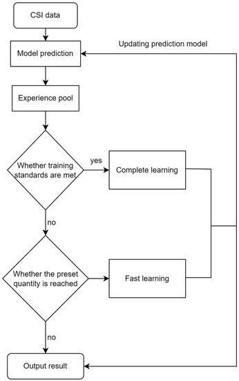 In this paper, the prediction phase adopts the same sequence arrangement as the training phase, using K known CSIs obtained from the actual communication system to predict P unknown CSIs in the future. In this paper, the experience pool mechanism is introduced in the prediction stage, in order to reduce the accumulation of prediction errors in the neural network model and improve the prediction accuracy. The size of the experience pool is kept consistent with the size of the data block, and its real CSI is stored in the data pool after each sequence of prediction. When the number of predictions is equal to the set parameter h, the system fetches the experience pool data for fast learning, which has adjusted the prediction model; when the experience pool data are all updated, the algorithm will fetch the data for full learning to optimize the prediction network model. Fast learning is performed when the data in the data pool is updated to a certain extent, and full learning is performed when the data pool is completely updated. Both use the same length of data, but the number of times the model is trained is different. The flow of the online prediction algorithm is shown in Figure 7: