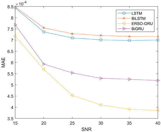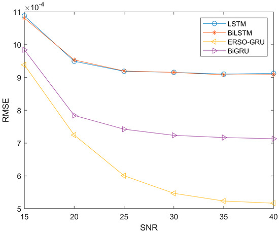 Since the experiment was repeated 100 times and the average values of MAE, MSE and RMSE were obtained, the same type of results was presented. From Figure 8, Figure 9 and Figure 10, throughout the process of increasing the SNR, the ERSO-GRU algorithm outperforms LSTM, BiLSTM, and BiGRU on MAE, MSE, and RMSE. From Figure 8, Figure 9 and Figure 10, we can see that the MAE, MSE, and RMSE drop dramatically when the SNR increases from 15–30 dB, and then keeps decreasing; however, the improvement is becoming slow. As the SNR becomes sufficiently large, there is a diminishing return in terms of MAE, MSE, and RMSE, reaching an MAE, MSE, and RMSE floor. This is expected, as there is always prediction error even when the history CSIs are known perfectly.