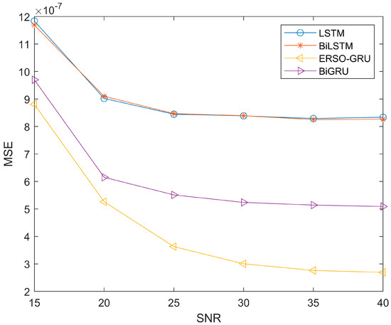 Due to the time-varying and multipath nature of the environment, the signal noise ratio will also change during signal transmission. So, to further compare with other methods, more measured channel data are used to verify the performance of the four methods. We use data from the UCI and add Gaussian white noise to measure the impact of signal-to-noise ratio on ERSO-GRU. The signal-to-noise ratio ranges from 15dB-40dB. The parameters of ERSO-GRU and LSTM, BiLSTM, and BiGRU models are the same except for the number of hidden layer units and the learning rate. However, the online experience pool mechanism proposed in this paper is unique to ERSO-GRU. To avoid the particularity of a certain experimental result, this paper repeated this group of experiments 100 times and took the average value of its evaluation criteria. Figure 8, Figure 9 and Figure 10 show the experimental results.