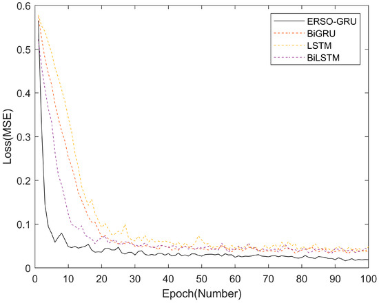 To verify the convergence speed and optimization speed of ERSO-GRU, data in NIST was used for experimental comparison of convergence curves with LSTM, BiLSTM, and BiGRU. The convergence curve was obtained from the offline training stage in the training model process. Among them, ERSO-GRU uses Snake Optimizer to find the optimal number of hidden layer units and learning rate.