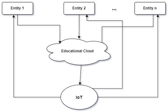 As can be seen in Figure 1, the architecture of our model proposes an educational system modeling method consisting of n entities, a cloud, and a private approach to IoT technologies.