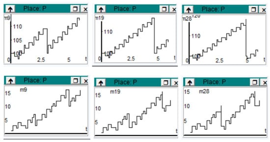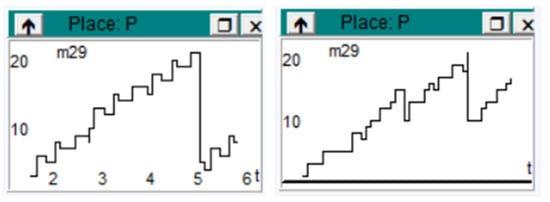 Two sets of diagrams are shown in the figures, depending on the speed of work for modeling the system. We have not chosen diagrams from the information processing method because it is considered an ideal flow in which there are no significant fluctuations in the information transport system that is shown in the diagrams. There is a constancy for the beginning elements of the technological process, but there is a large variation for the information to be analyzed as seen in the previous section.