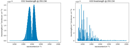 We developed a calculation program for the absorption coefficient to analyze the effects of temperature, pressure, and other interfering gases on the carbon dioxide absorption coefficient. First, the program is linked to the HITRAN database, and data are obtained and stored locally according to the molecular marker, isotopic labeling, and id number in HITRAN. Next, the spectral data of water molecules and carbon dioxide molecules obtained at different wave numbers are calculated and simulated, as shown in Figure 1. It is not difficult to see from the results that in the infrared band, the absorption peak range of carbon dioxide molecules and the absorption line strength of water molecules are lower than those of carbon dioxide molecules. At 2361 cm−1, carbon dioxide has the highest absorption line strength of 3.542 × 10−18. The absorption spectrum intensity of carbon dioxide molecules is six orders of magnitude higher than that of water molecules. Therefore, designing carbon dioxide sensors with an accuracy of one part per million in seawater environments can have good resolution. Then, the carbon dioxide molecular absorption coefficient based on the Voigt spectral line profile is calculated.