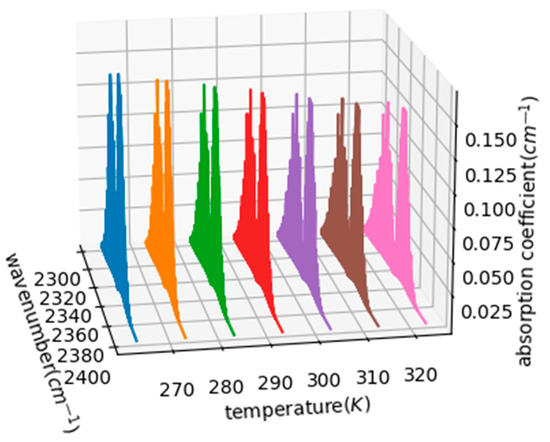 where γ is the Lorentzian half-height width; is the Doppler half-height width; and T and are temperature and air pressure, respectively. It is known from Lambert’s law that changes in the absorption coefficients of carbon dioxide affect the accuracy of the concentration measurements. The Voigt line pattern can provide important spectral information, such as line width, offset, and intensity. The actual spectral line pattern is closest to the Voigt line pattern, which is the convolution of the Doppler and Lorentz line pattern. Usually, the environment temperature of seawater varies from 263.15 K to 323.15 K (−10 °C~50 °C), and the atmospheric pressure in shallow seawater is generally 1 atm. The program analysis wavenumber is set in the waveband of two absorption peaks of carbon dioxide molecules, between 2300 cm−1 and 2400 cm−1. Then, the temperature of the program is set to 263.15 K, 273.15 K, 283.15 K, 293.15 K, 303.15 K, 313.15 K, and 323.15 K, and standard atmospheric pressure is used to obtain the carbon dioxide absorption coefficient between 2300 cm−1 and 2400 cm−1 at different temperatures, as shown in Figure 2.