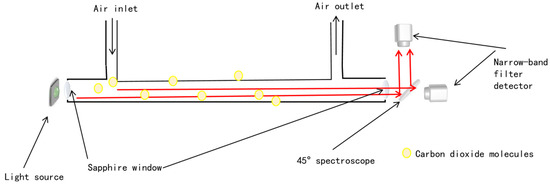 In the previous section of the molecular spectrum, the result showed that the absorption peak of carbon dioxide molecules at 2361 cm−1 was 3.542 × 10−18 molecules/cm2. This was the basis for our selection of the measurement point and reference point. Therefore, a narrow-band filter with a center wave number of 2361 cm−1 was selected at the measurement end, and a filter with a center wave number of 2531 cm−1 was selected at the reference end. The filters were placed in front of the thermopile detector, respectively, to prevent the interference of light in other frequency bands. In practical applications, it is necessary to consider the gas–liquid separation structure and signal conditioning method, which will affect the cost and detection performance of the device.