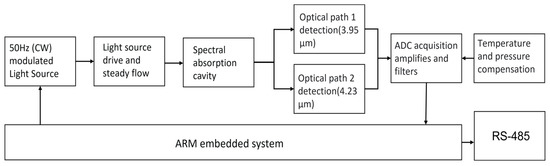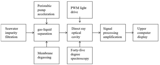 The system configuration used for seawater-dissolved carbon dioxide: Based on the infrared post-spectroscopic technology, a seawater carbon dioxide online monitoring system was designed and its system block diagram is shown in Figure 7.