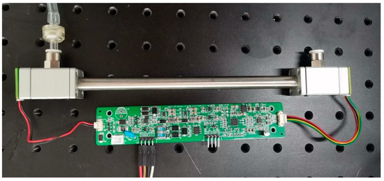 Figure 4 depicts the schematic diagram of the post-infrared spectroscopic structure. As shown in Figure 5, when seawater enters the seawater cavity, it contacts with the permeable membrane, and the molecular diffusion of carbon dioxide diffuses into the optical cavity. Figure 6 shows the actual structure. Due to the influence of temperature on the absorption coefficient of carbon dioxide molecules, it is necessary to control the system at a constant temperature. The temperature control adopts a PTC constant-temperature electrothermal film wrapped on the external pipe wall. This material has self-limiting current characteristics, that is, under a certain voltage, the current size will be automatically adjusted to ensure the stability of the surface temperature of the membrane material.