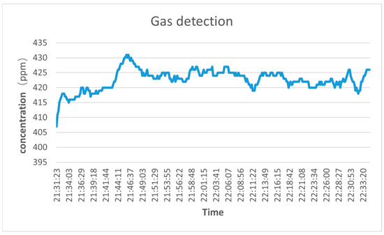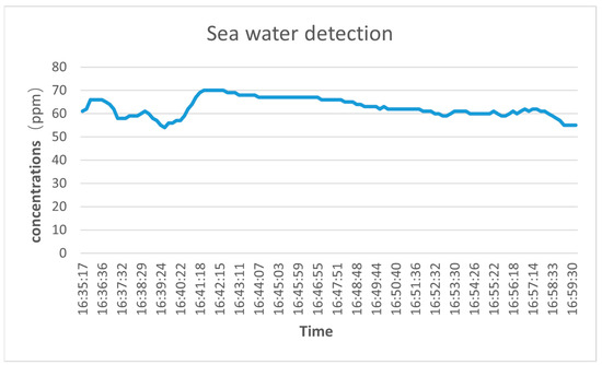 In order to evaluate the performance of the seawater-dissolved carbon dioxide detection system designed in this paper, the system is tested in the atmosphere and shallow seawater. Firstly, the stability of the sensor system is tested to verify that it can meet the needs of online detection. The equipment is sealed in a closed container, and the power line and signal line are extracted through the flange port. The gas detection temperature is 293.15 K and the pressure is 1 atm. Through multiple measurements using NDIR gas sensors, the concentration of carbon dioxide in the atmosphere is 420 ppm, the sampling time is ten seconds, and the continuous online monitoring time is one hour. The gas test environment is selected in an open outdoor environment to avoid the impact of breathing and industrial activities on the test. The test results are shown in Figure 10.