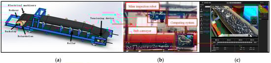 Experimental environment and hardware facilities. (a) 3-D model of belt conveyor belt; (b) experimental equipment diagram; (c) upper computer system of mining inspection robot.