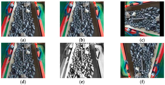 Partial image enhancement effect. (a) Original image; (b) random flip; (c) random cropping; (d) noise enhancement; (e) grayscale enhancement; (f) random rotation.