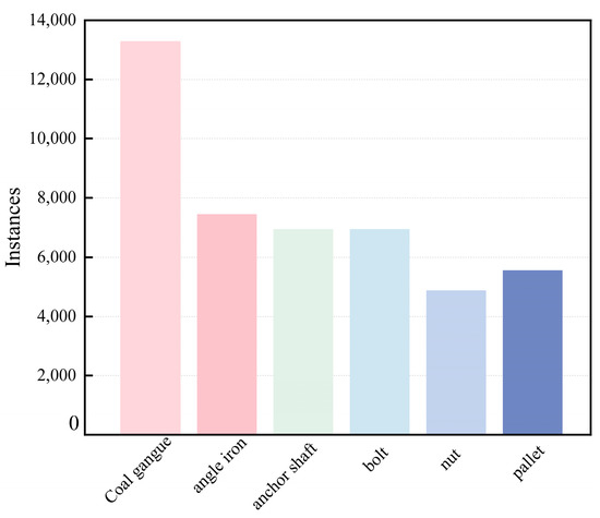 Based on the statistical analysis combined with Figure 3, among the 44,480 data labels, a significant proportion is occupied by coal gangue due to its generation throughout various stages of coal mining and coal preparation processes. On the other hand, the distribution of other foreign objects, such as anchor rods, angle irons, nuts, trays, and screws, is relatively uniform.