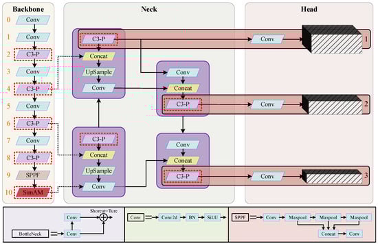Specifically, to enhance the model’s ability to handle complex backgrounds and extract features of foreign objects, a lightweight attention mechanism called Simple Attention Module (SimAM) [25] is introduced to the feature extraction network. Furthermore, a novel lightweight convolution (PConv) [26] is proposed, and the C3 module of the network is redesigned to optimize the model’s parameter quantity and computational speed. Additionally, the bounding box regression loss function CIoU is replaced with SIoU, leading to improved convergence speed and detection accuracy of the model. The modified architecture, as shown in Figure 4, highlights the improved components with red dashed boxes. Further details about the improvements are elaborated in subsequent subsections.