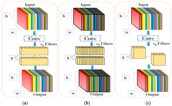 Comparison of PConv with other convolutional structures. (a) Conv; (b) DWConv; (c) PConv.