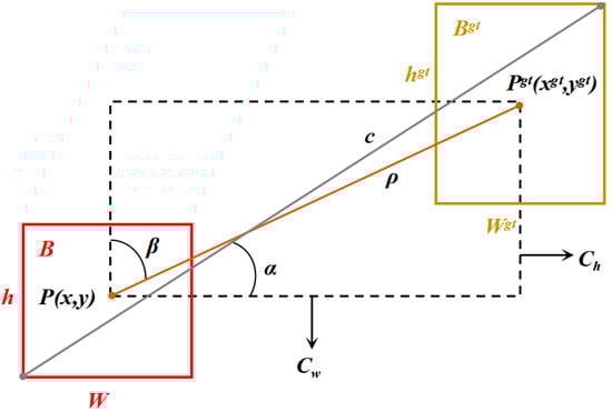 The loss function serves to quantify the disparity between the model and actual data. In the original YOLOv5s network, the border regression loss utilizes the Complete Intersection over Union (CIOU) metric [37], which is computed as follows: