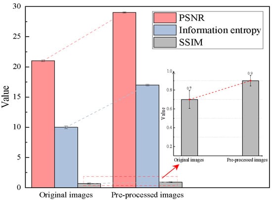 The average PSNR, SSIM, and information entropy values of the preprocessed image are shown in Figure 10 and Table 3. The results indicate that the preprocessed image is clearer than the original image, as evidenced by its higher PSNR, SSIM, and information entropy.