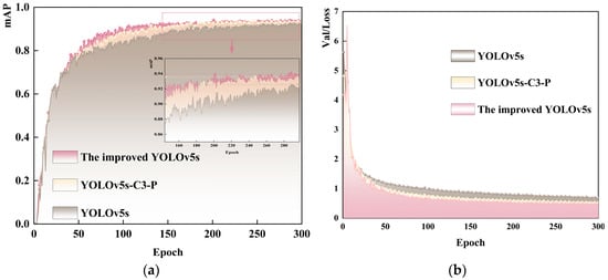 In this study, YOLOv5s was selected as the baseline model, and the improved model was compared with the baseline. The significance of the algorithm improvement was evaluated based on metrics such as precision (P), recall (R), mean average precision (mAP), parameter amount, and inference speed. The formulas for precision, recall, and mAP are as follows:
