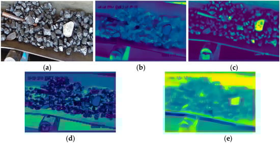 This paper compares several image enhancement algorithms commonly applied in coal mining, including grayscale enhancement algorithms, histogram equalization algorithms, and dark-channel-based image-defogging algorithms. The experimental results demonstrate that the dark-channel-based defogging algorithm provides the best pre-processing of the acquired data, producing sharper contours and better highlighting the features of foreign objects and backgrounds. The effect of partial enhancement is shown in Figure 9. From a subjective perspective, the original image is relatively blurry regarding the contour of foreign objects. The enhanced dark channel defogging image reduces noise and sharpening, which is more conducive to the network model’s extracting non-coal foreign object features.