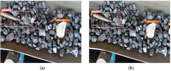 Obtaining good results on a single dataset instills confidence in the model’s generalization capabilities to other non-coal foreign object datasets. However, due to the specificity of the application scenario, there is currently no publicly available dataset for foreign object detection on conveyor belts. Introducing foreign objects into a coal mine conveyor belt artificially would violate safety regulations. Taking safety factors into consideration, the validation was conducted at the National Joint Local Engineering Laboratory in Taiyuan, Shanxi Province, China. Additionally, this study further evaluated the generalization performance of the new model by using the dataset from [18]. The datasets are labeled as DataI and DataII, and the evaluation results are presented in Table 12 and Table 13. Partial recognition results are shown in Figure 16.