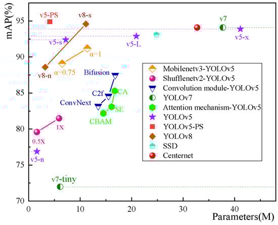 The comparative results are shown in Figure 14. Although the Mobilenetv3 and Shufflenev2 network models reduce the number of parameters, they also suffer from a slight decrease in detection accuracy. While SSD and Centernet algorithms achieve detection accuracy above 90%, their large model parameter sizes are not conducive to edge computing. As for convolutional modules such as Bifusion [49], C2f, and ConvNext, their balance between detection accuracy and model size is lower than that of YOLOv5s.