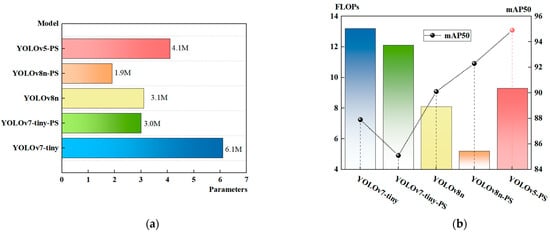 The results of the improved YOLO series of algorithms. (a) Parameter results; (b) mAP50 and FLOPs results.
