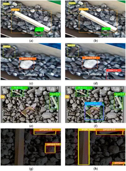 Partial recognition results. (a–d) Recognition results before and after the improvement of DataI; (e–h) recognition results before and after improvement of DataII. The left column shows the recognition results before improvement, and the right column shows the results after improvement.