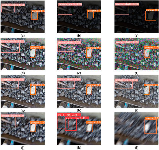 - In order to assess the impact of different underground coal mine conditions on the network’s detection results, we conducted corresponding image processing techniques, as shown in Figure 17 (the left column represents minor processing, the middle column represents moderate processing, and the right column represents severe processing).