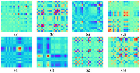 MTF-encoded images of 8 types of fault: (a) normal; (b) inner ring; (c) outer ring; (d) rolling element; (e) inner ring + outer ring; (f) inner ring + rolling element; (g) outer ring + rolling element; (h) inner ring + outer ring + rolling element.