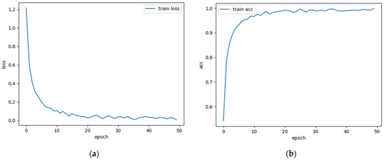 Loss and accuracy in training with 50 epochs: (a) loss; (b) acc.